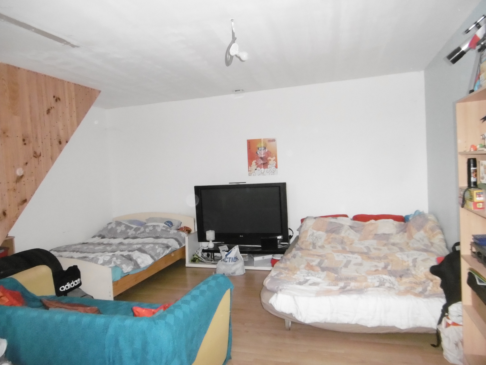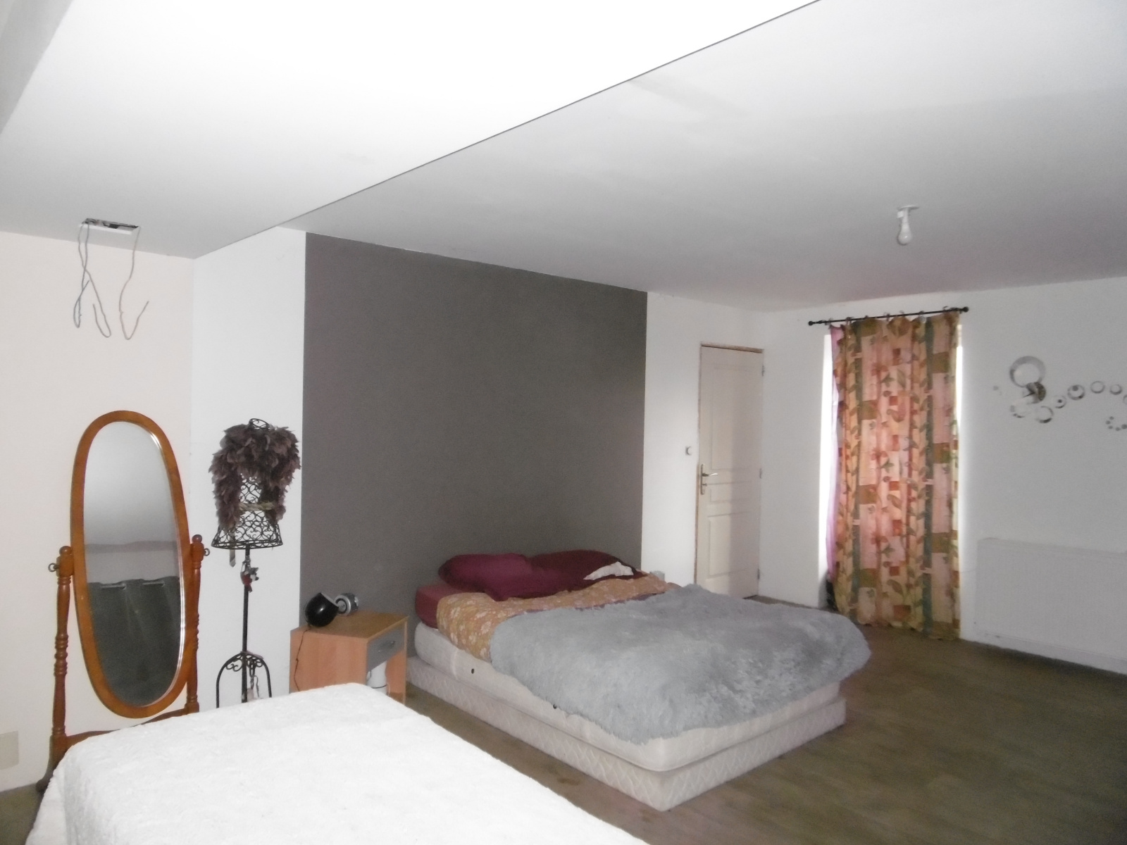 Etage avec palier, couloir en passerelle, une grande chambre avec résevation pour douche et toilettes, deux autres chambres, toilettes.