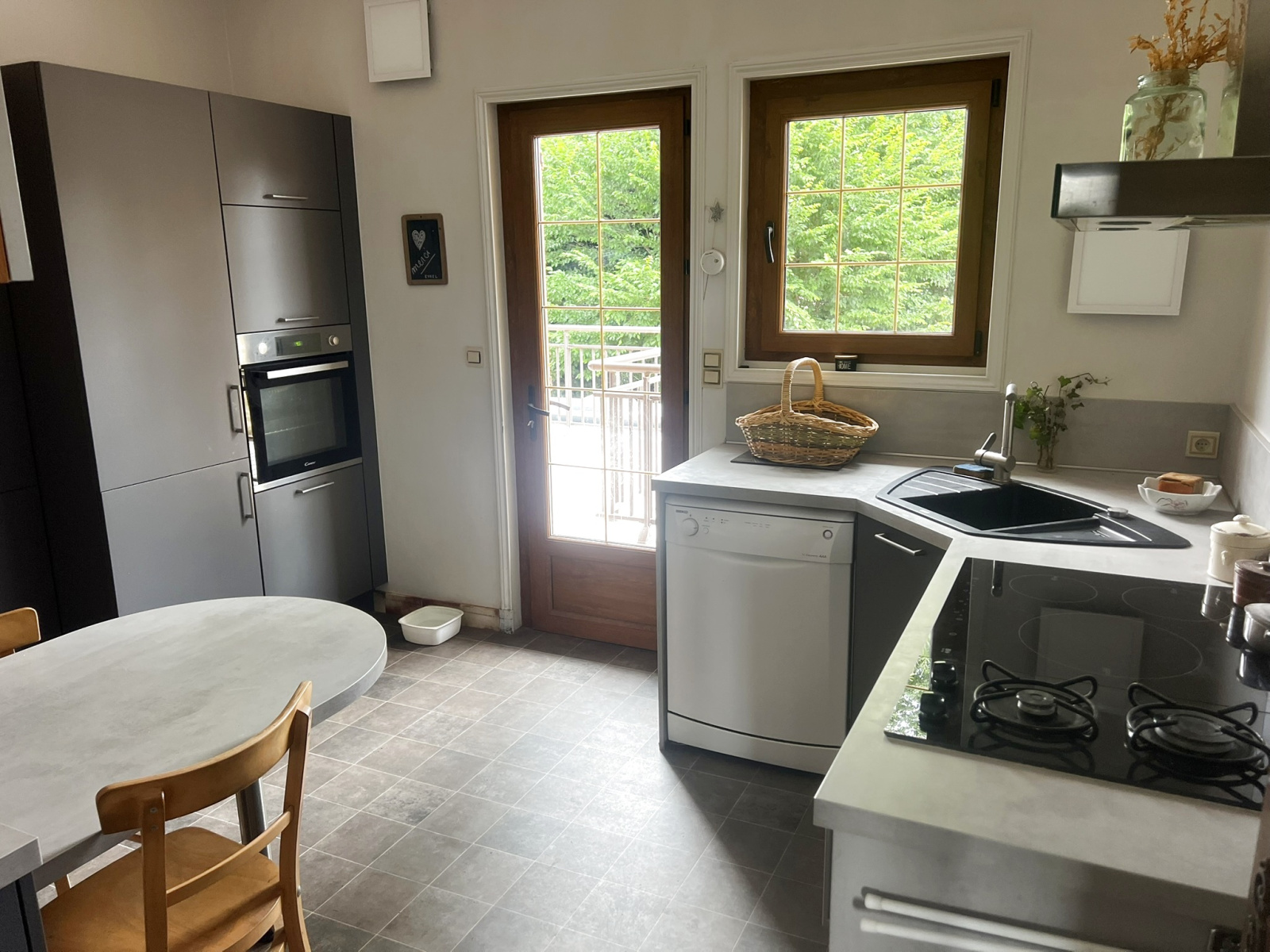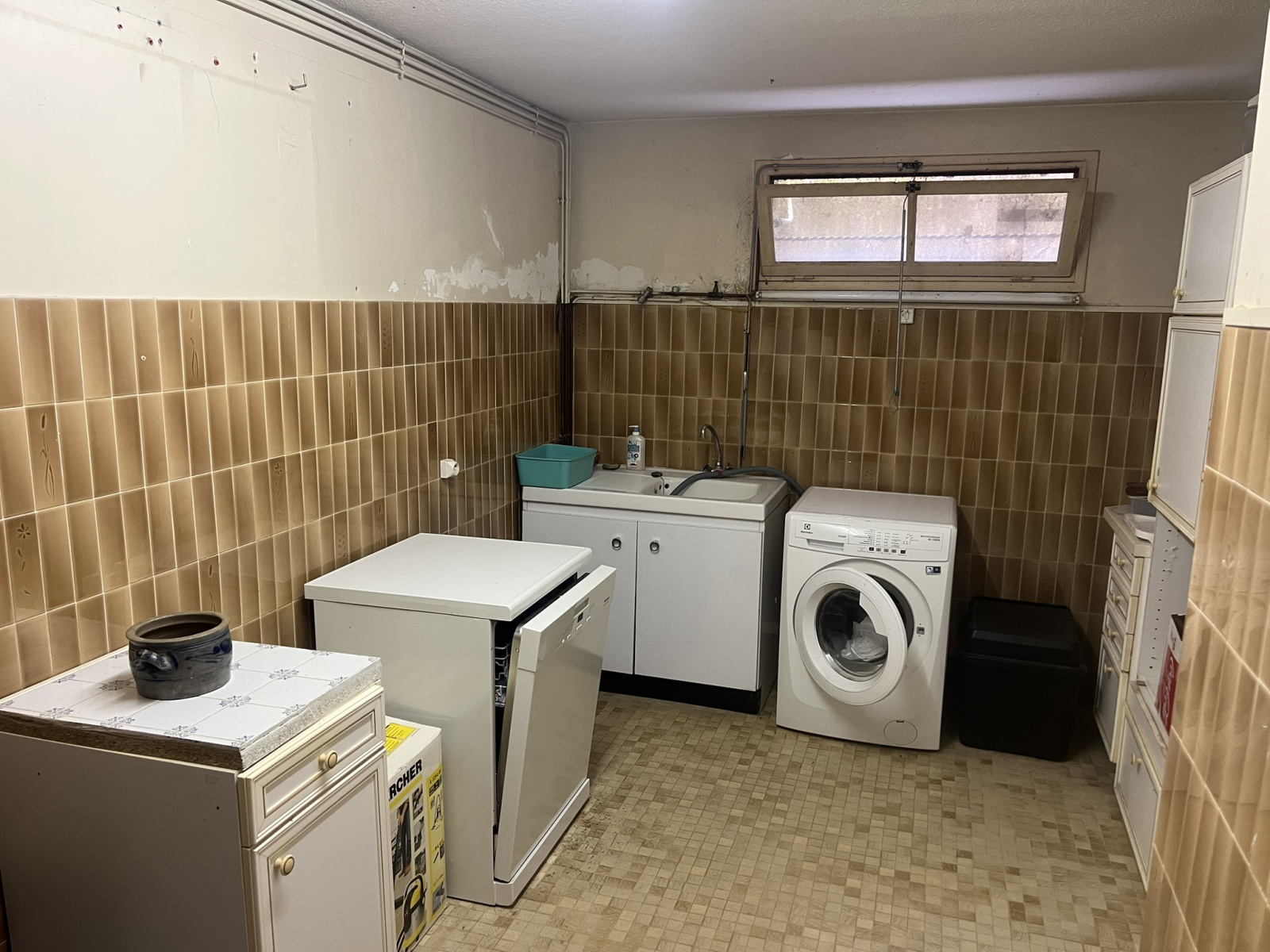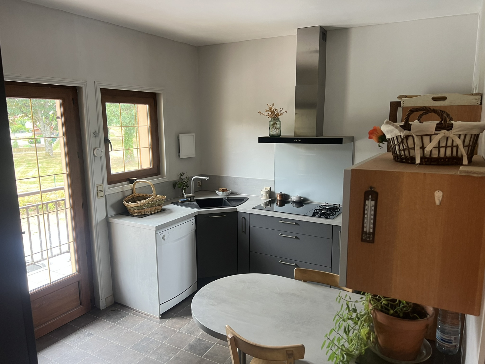 Rez-de-jardin : cuisine d’été, salon, bureau, chambre, salle d’eau avec WC, buanderie, cave, espace de stockage et garage.